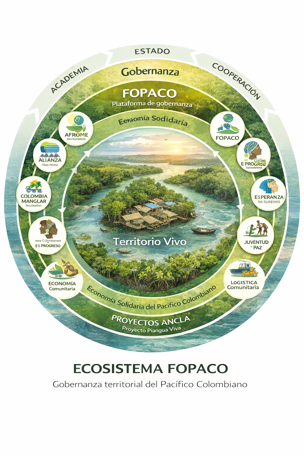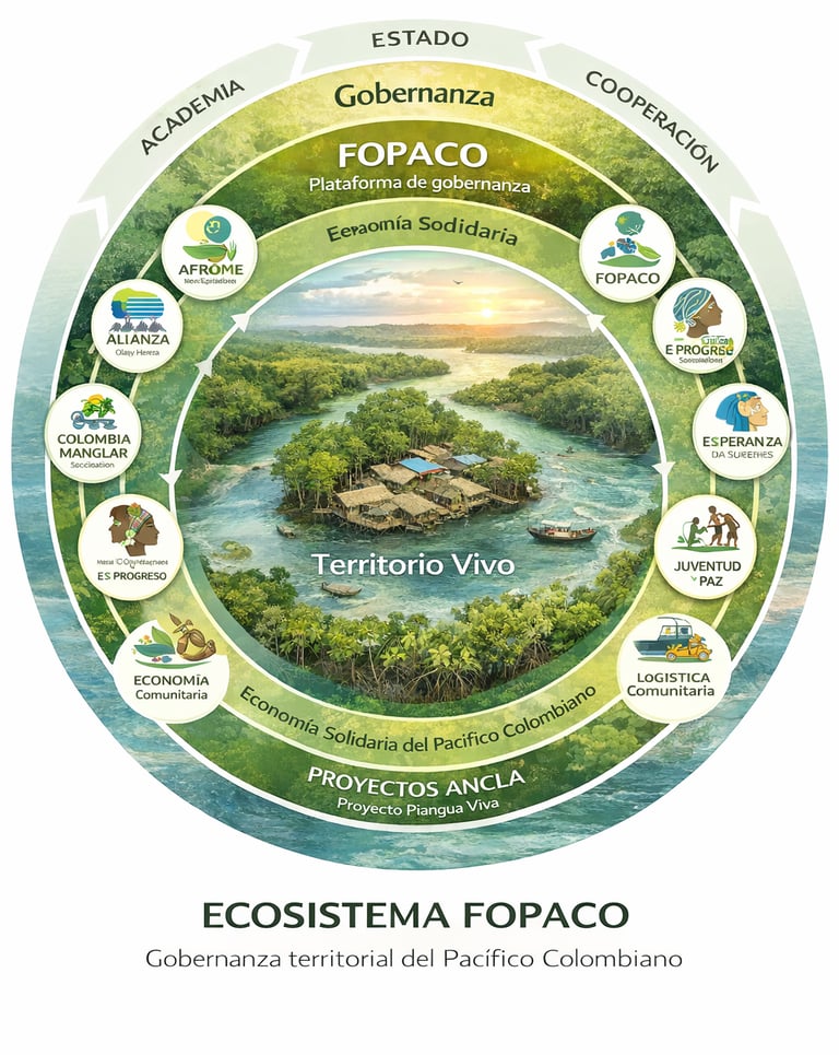 el territorio como núcleo, las organizaciones como nodos vivos, los sistemas funcionales como motores, FOPACO como plataforma de gobernanza y los proyectos ancla como expresión concreta de acción.