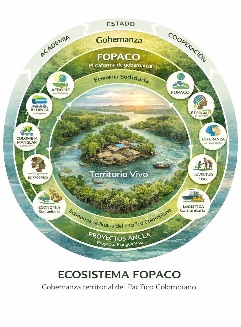 El Ecosistema FOPACO es una red territorial organizada que articula organizaciones de base, economías comunitarias, saberes ancestrales y procesos de conservación en el Pacífico colombiano.